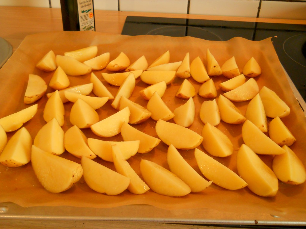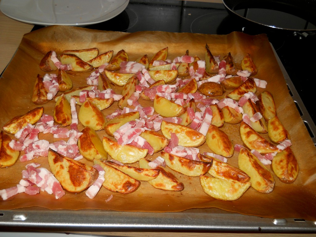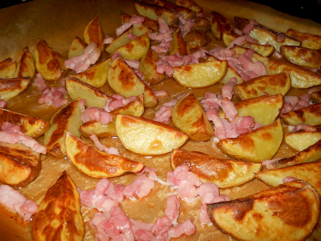Am pus la cuptor niste cartofi, i-am stropit cu ulei de masline, am pus sare si sunca. Preparare extrem de simpla, rezultat de lins pe degete (la propriu, sunca lasa grasime).