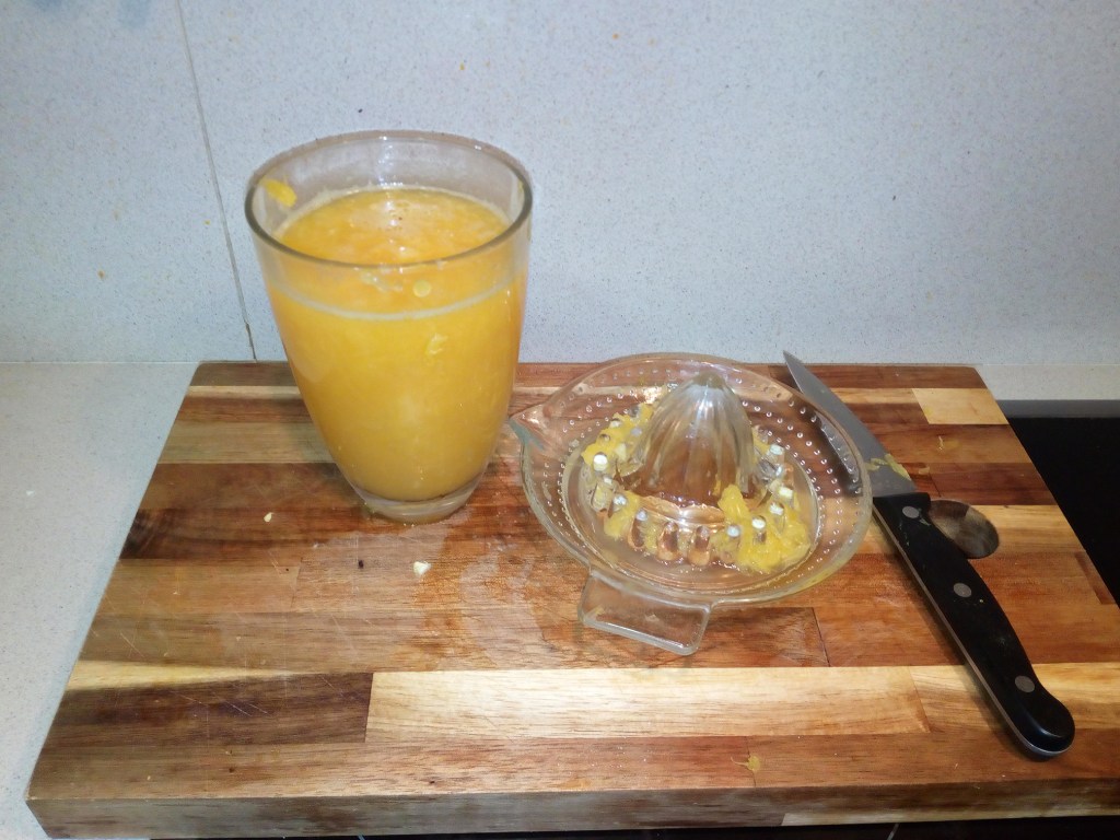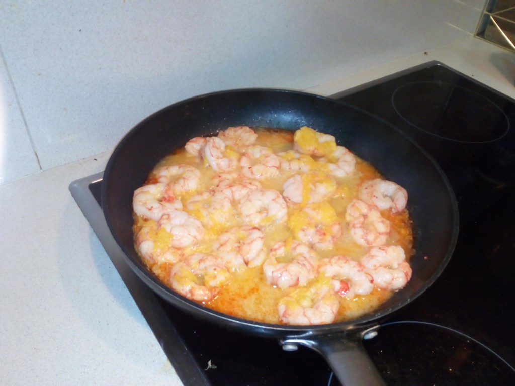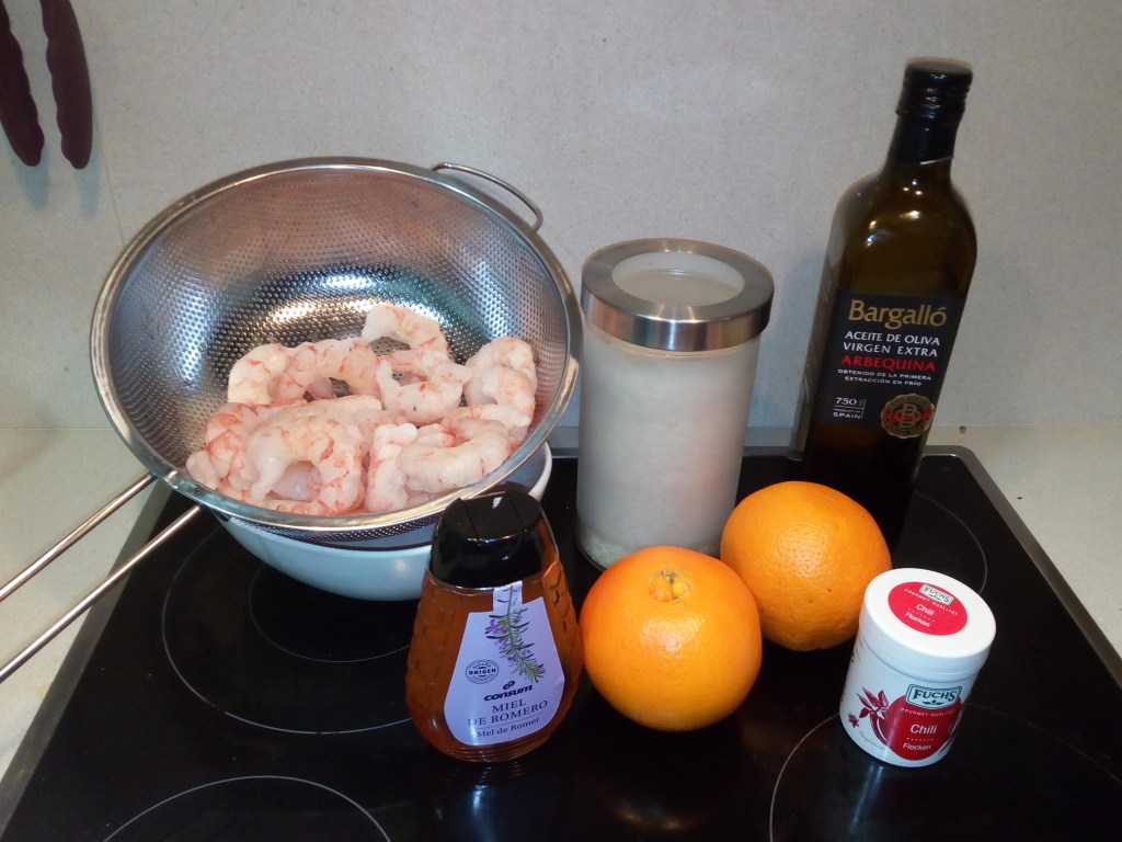 Se stoc portocalele. Se prajesc crevetii in tigaie cu ulei, sucul de portocale, chilli, miere.