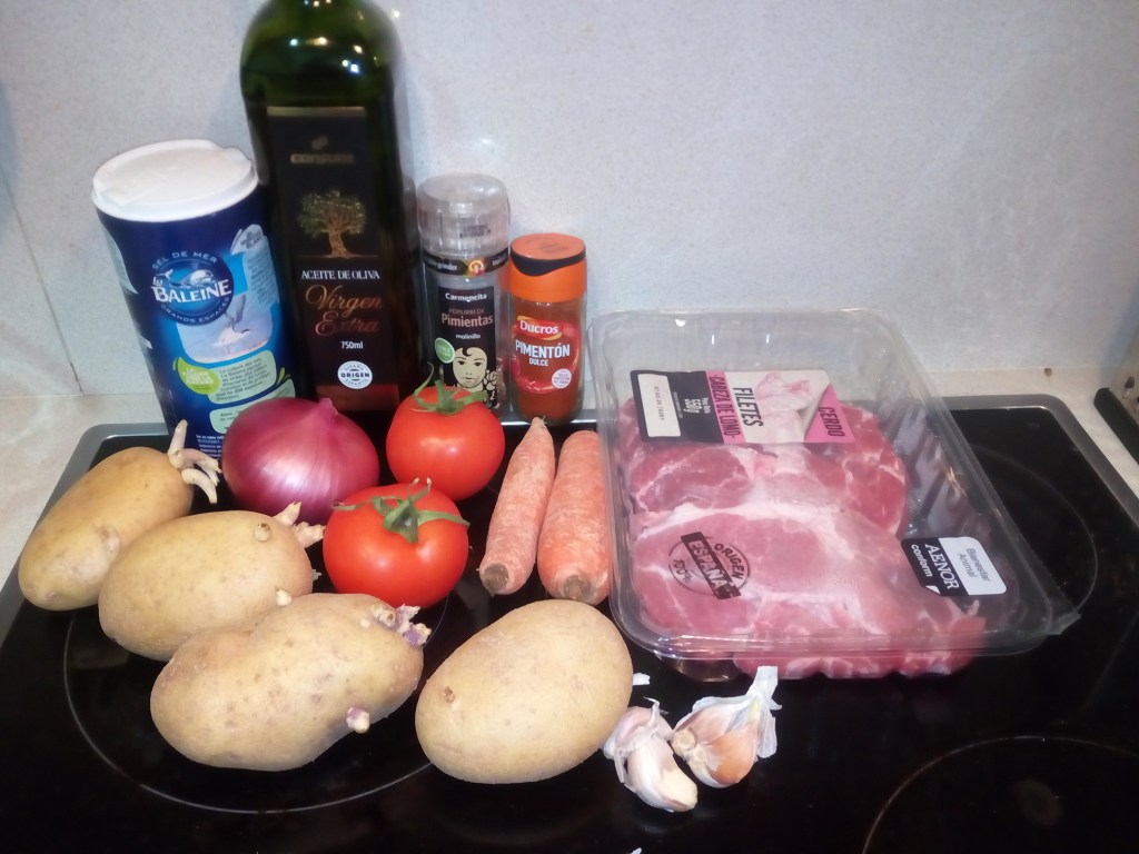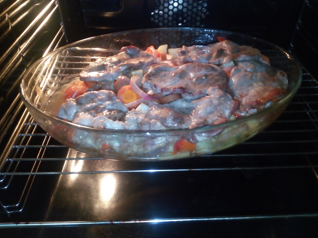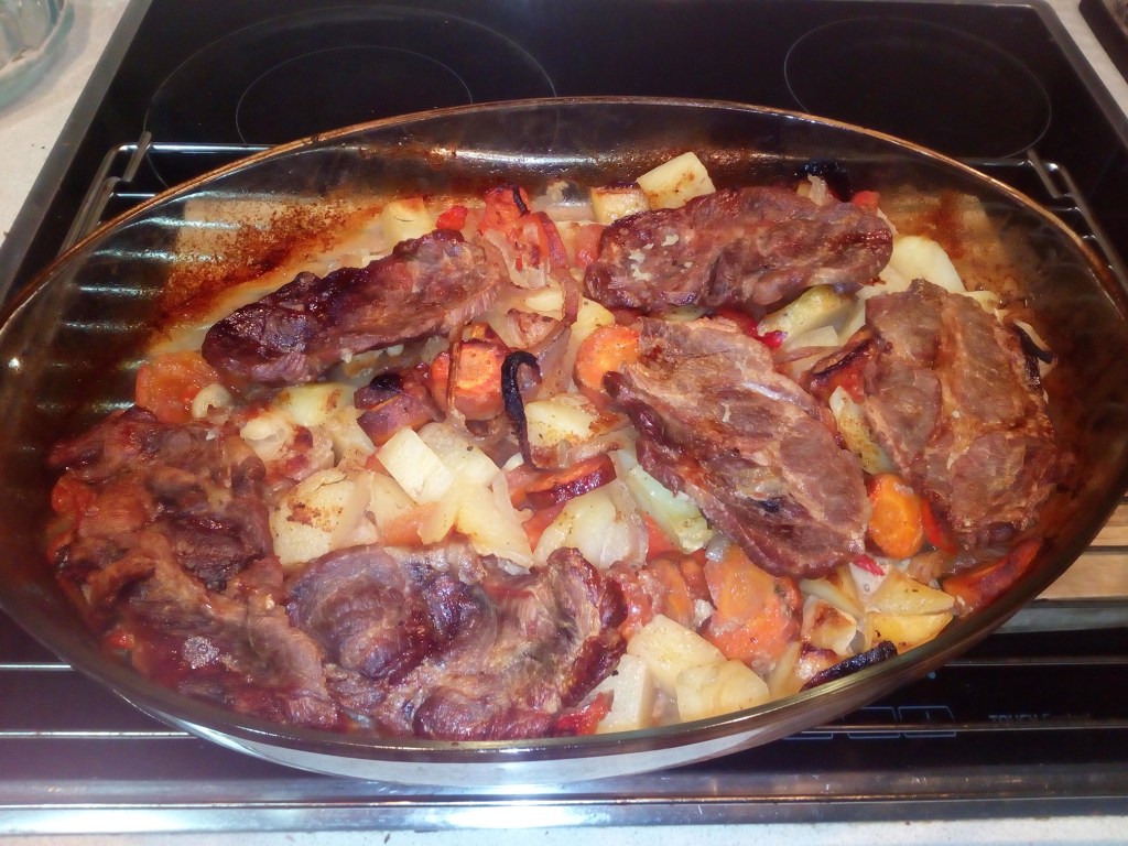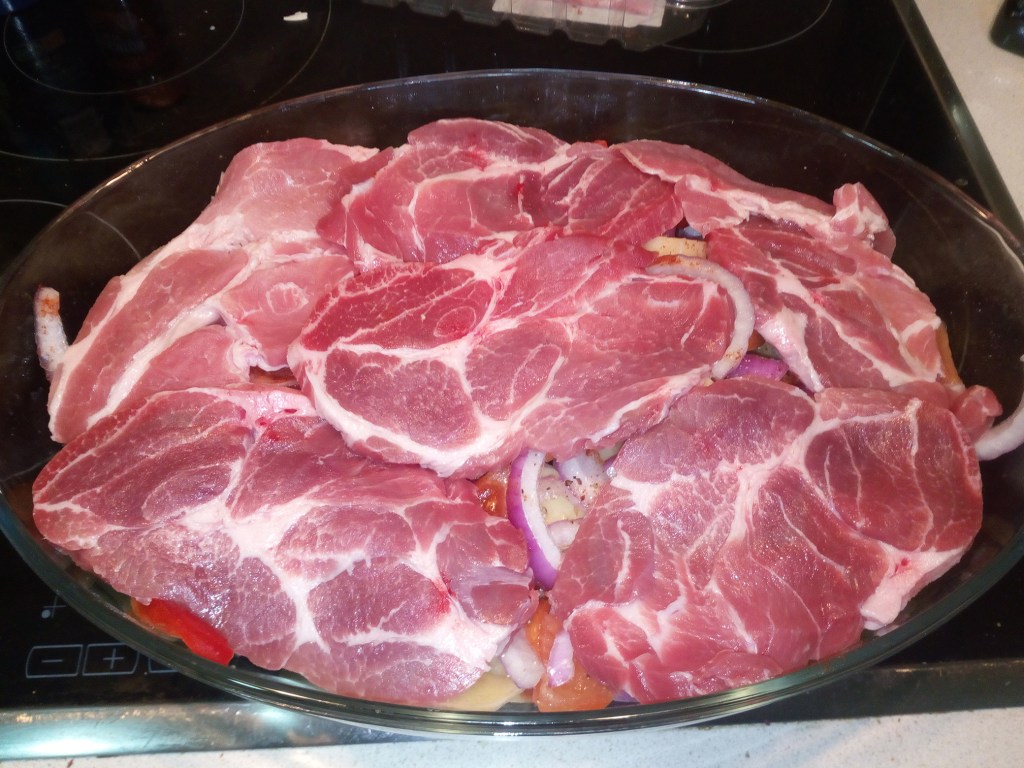 Se taie legumele cubulețe, se pun în tigaia unsă cu puțin ulei, se adaugă sare, piper, boia. Se pune deasupra carnea de porc. Se acoperă cu o folie de aluminiu și se dă la cuptorul preîncins la 170 de grade. Se lasă la cuptor o oră și jumătate, după care se scoate folia și se adaugă un pahar cu apă. Se mai lasă la cuptor pentru o oră la 170 de grade, apoi pentru încă 20 de minute la 200 de grade.
