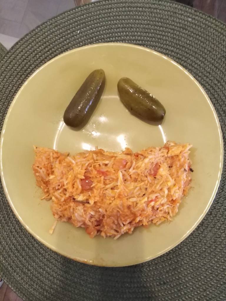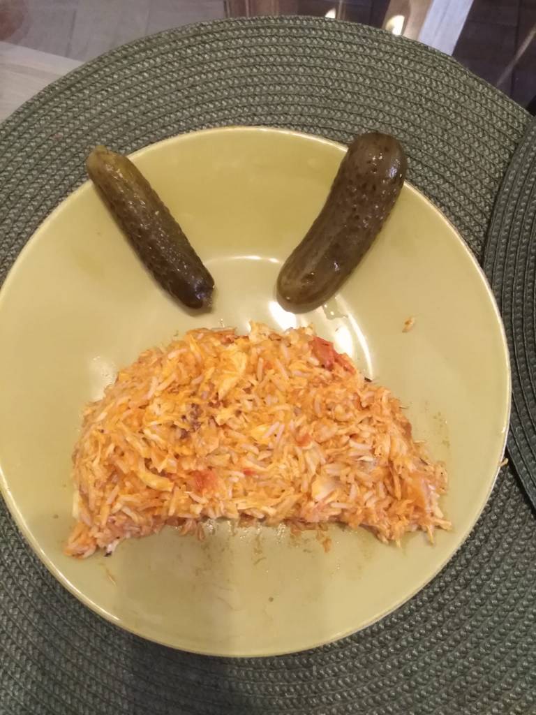 Deasupra se pun două cutiuțe de orez basmati (sunt acele recipiente care se pot face și la microunde) și se amestecă în continuare. Se adaugă jumătate de pungă de brânză rasă. Se amestecă puțin, până când brânza se topește și integrează în amestec.