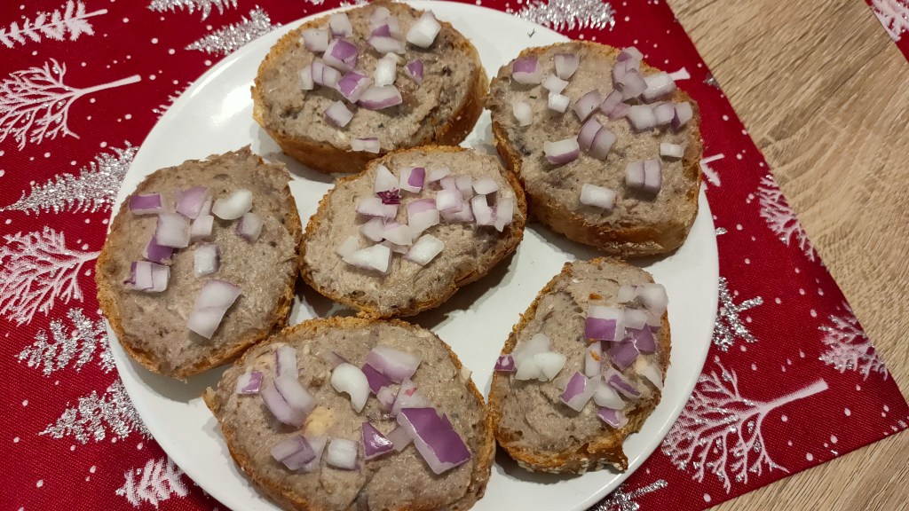 New entry pe 2020: o conservă de sardine, o conservă de anșoa, 3 cm de cub de unt și jumătate de lămâie stoarsă, totul bine frecat până se face pastă. Se întinde pe sus-menționata catalană și deasupra se pune ceapă roșie cubulețe.