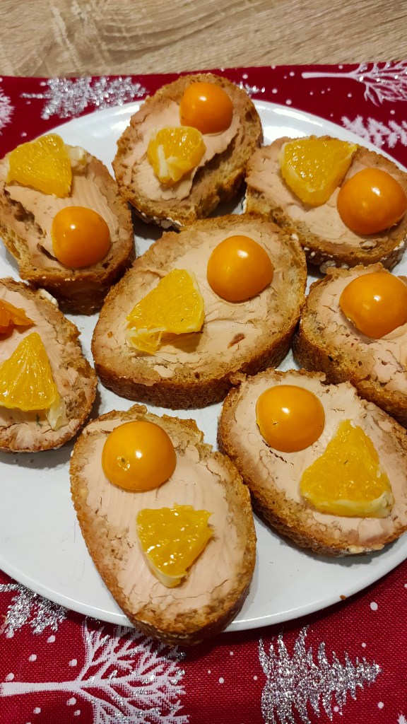 Foie gras cu felii de portocală și physalis.