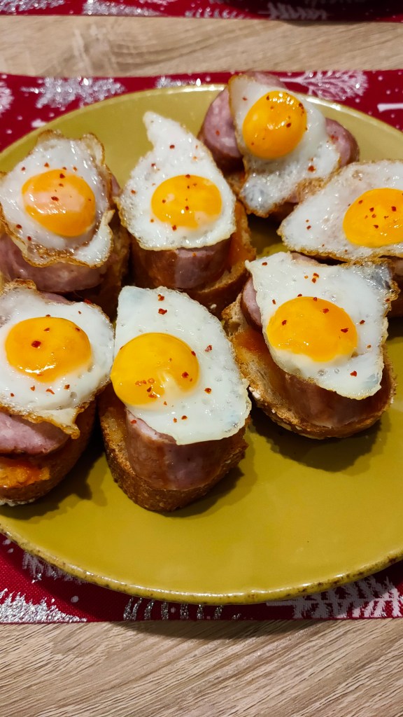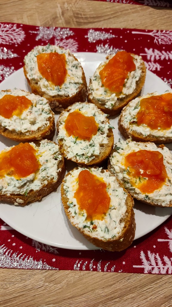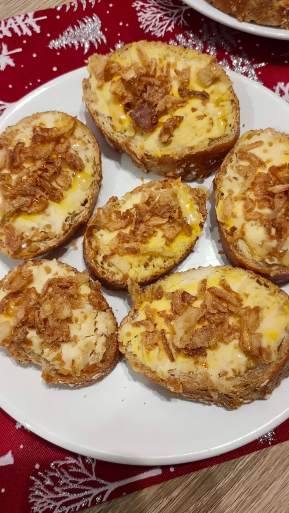 Următorul pinchos îl fac la fiecare revelion de prin 2013, cred. E simplu și spectaculos: un rond de brânză de capră (îi spun chevre, probabil pentru că în Luxemburg am început să mănânc mai des), ceapă confiată și miere. În 2020 am cumpărat o chevră de la Mercadona, deja amestecată cu ananas și migdale. Foarte reușită.