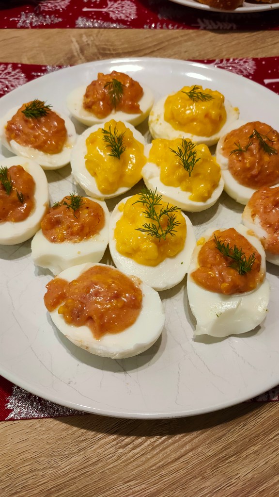 Pentru mine, de la un Revelion nu pot lipsi ouăle umplute. Am făcut două umpluturi, una cu maioneză și cu gălbenuș fiert de ou, alta cu maioneză, gălbenuș fiert de ou și pateu de ficat.
