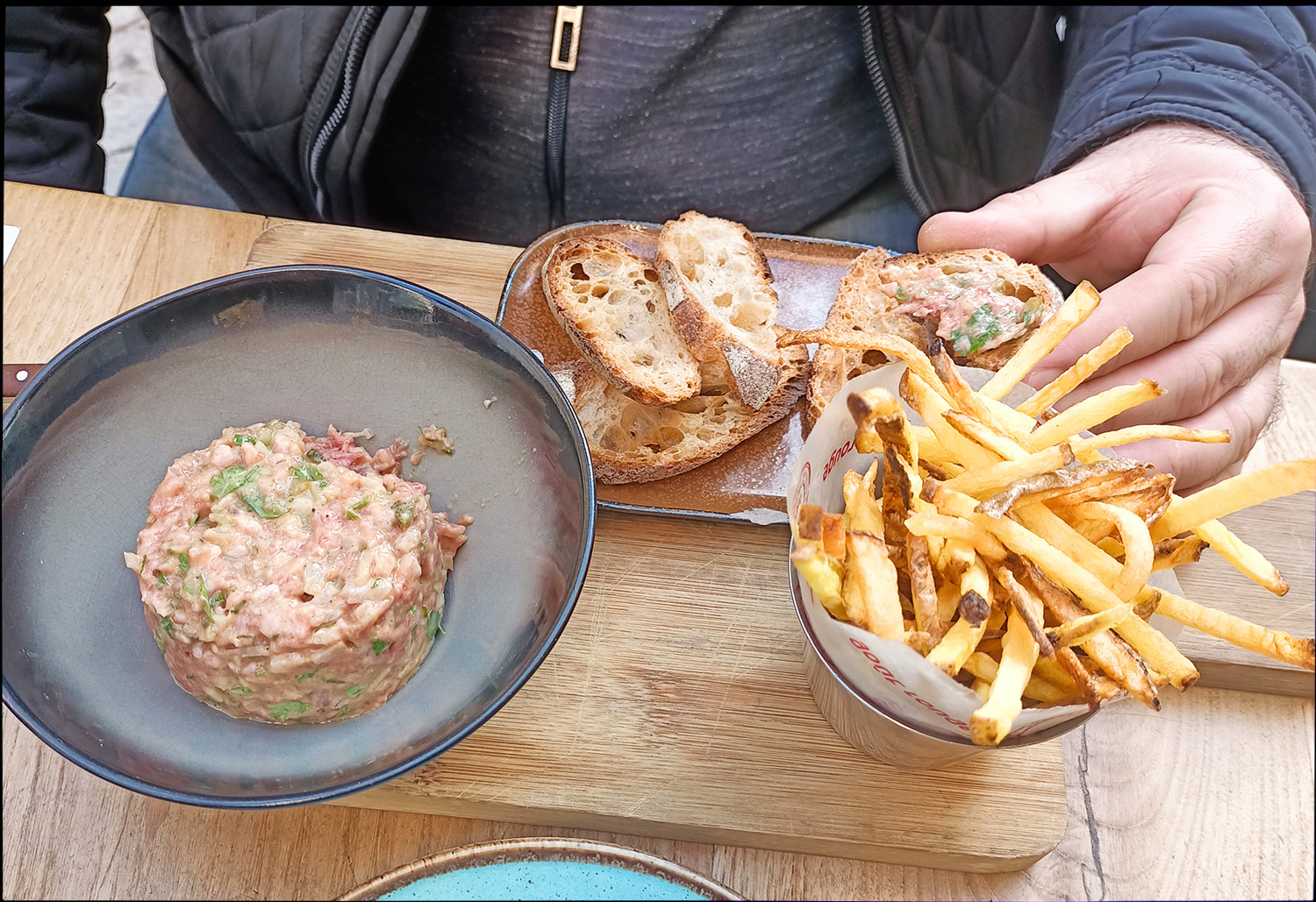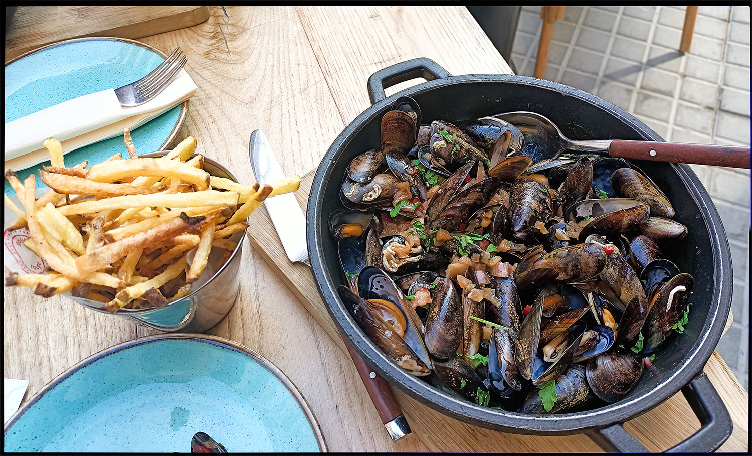 Am făcut o rezervare pentru vineri la prânz, am prins și o masă pe terasă. Comunicarea cu chelnerița italiancă a fost destul de dificilă. Eu am comandat tartarul de vită ( 18€ ) și Luiza scoicile (nu îmi mai amintesc prețul, undeva pe la 15€ ). Ambele servite cu cartofi prăjiți, spune meniul. Cartofii prăjiți s-au dovedit a fi cartofi pai – poate un câștig pentru estetică, dar cel puțin scoicile sigur ar fi mers mai bine cu niște cartofi prăjiți clasici. Tartarul a fost foarte bun, scoicile au fost pe gustul Luizei, mie nu mi-au plăcut în mod deosebit și cu siguranță soiul lor nu m-a încântat, aveau relativ puțină carne.