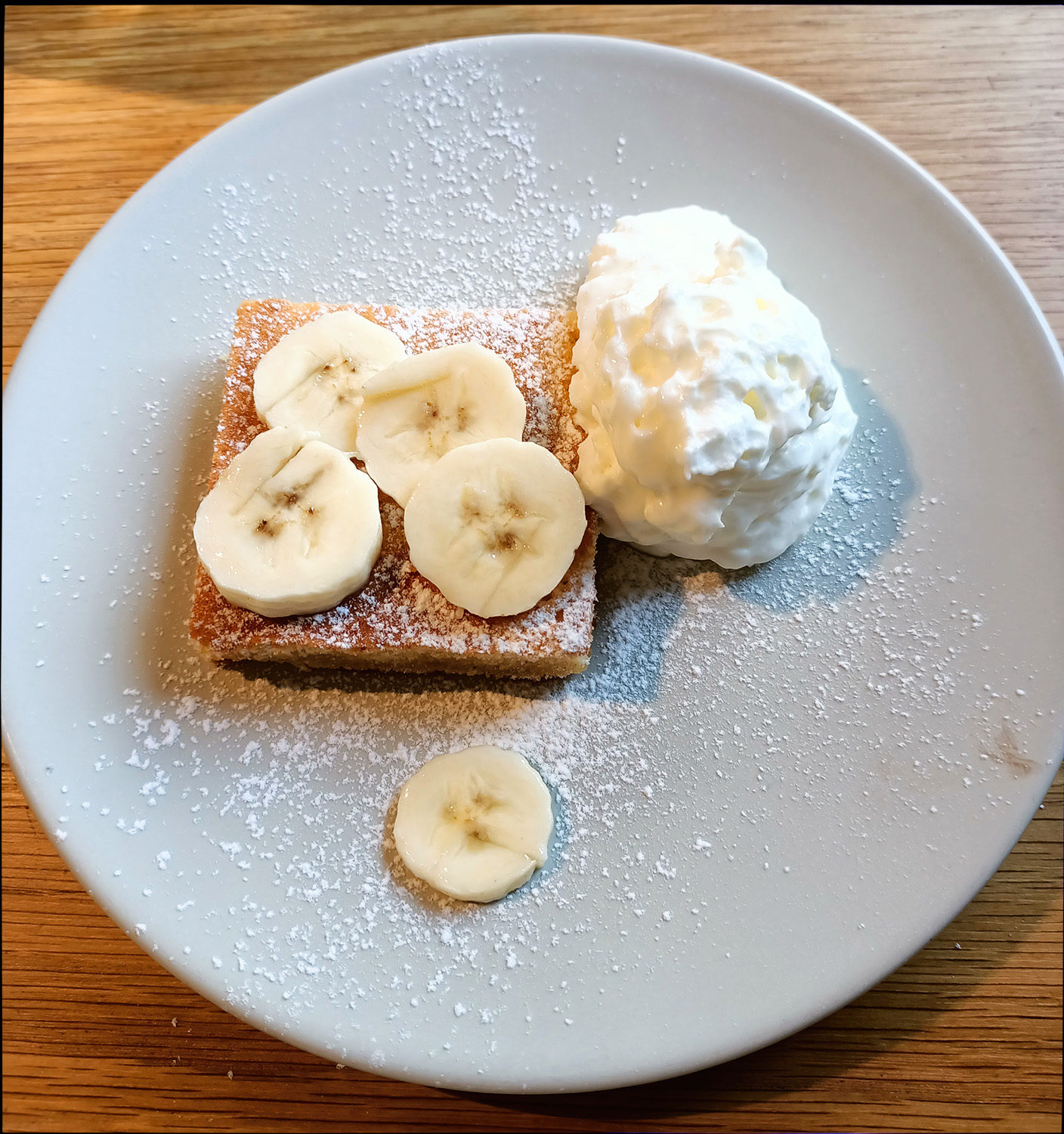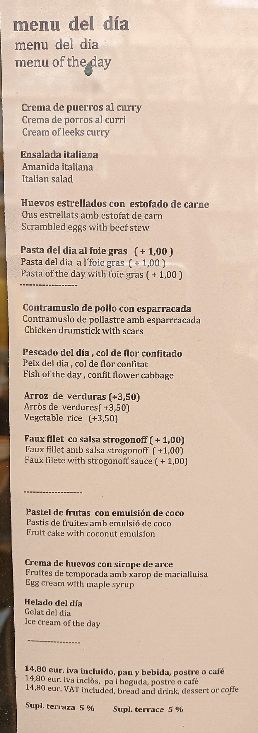 Eu am luat la aperitiv ouă ochiuri cu cartofi și friptură de vită (fel de mâncare extrem de spaniol), iar Luiza supă cremă de praz cu curry. Fel principal am luat „pescado del dia”, adică „peștele zilei”, adică un somon făcut cu conopidă (eu) și friptură cu sos stroganoff (Luiza). Desert o tartă de fructe cu frișcă (Luiza) și o bulă de înghețată (eu). Am băut câte o Cola la 350 ml, cantitate enormă pentru un restaurat chiar și în Spania, ca să nu mai vorbim de alte țări.