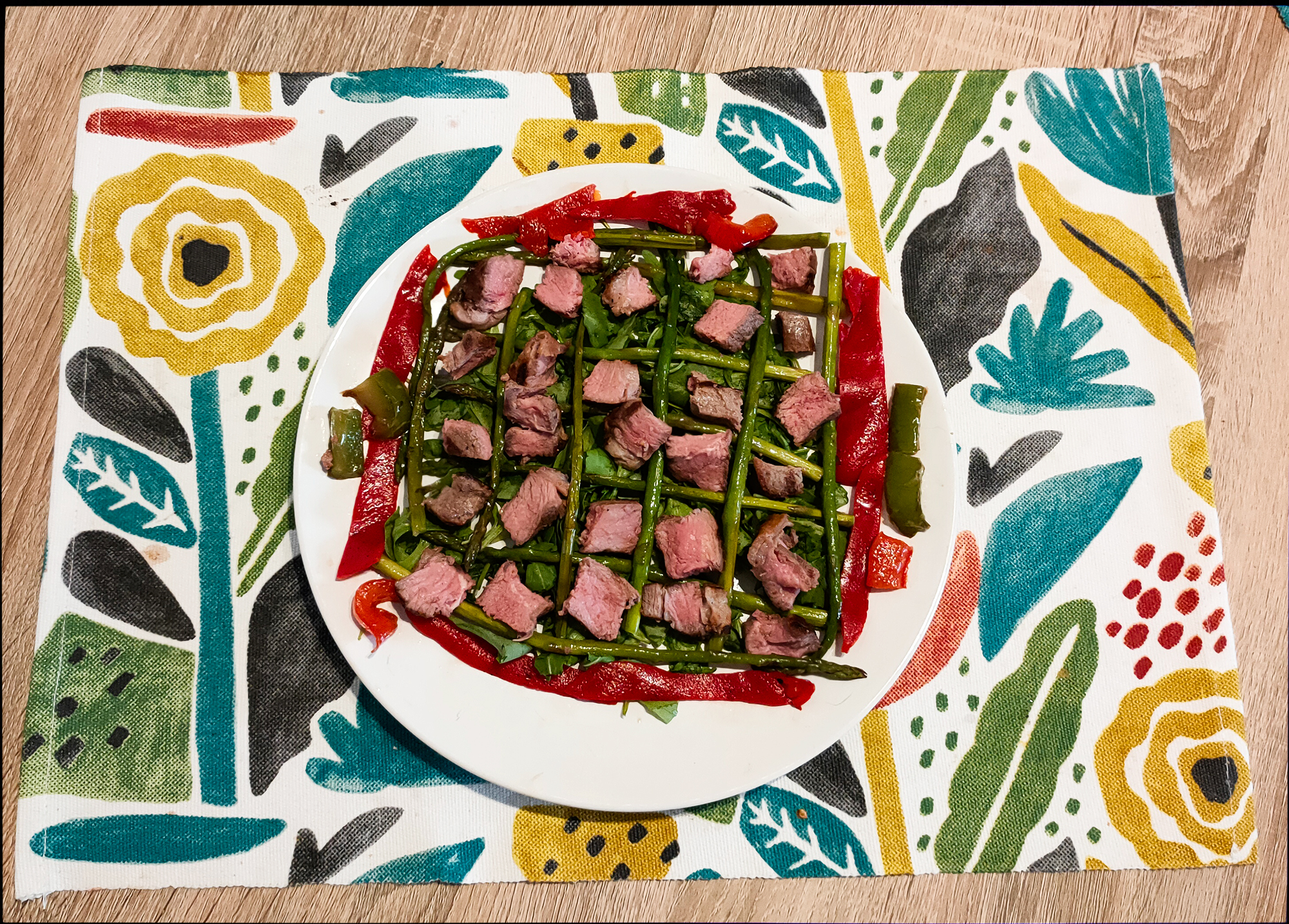 Antricot de vita la gratar taiat cubulete si pus pe o structura cu patratele. Adica o mana de rucola peste care am pus sparanghel calit in unt, inconjurat de ardei copti.