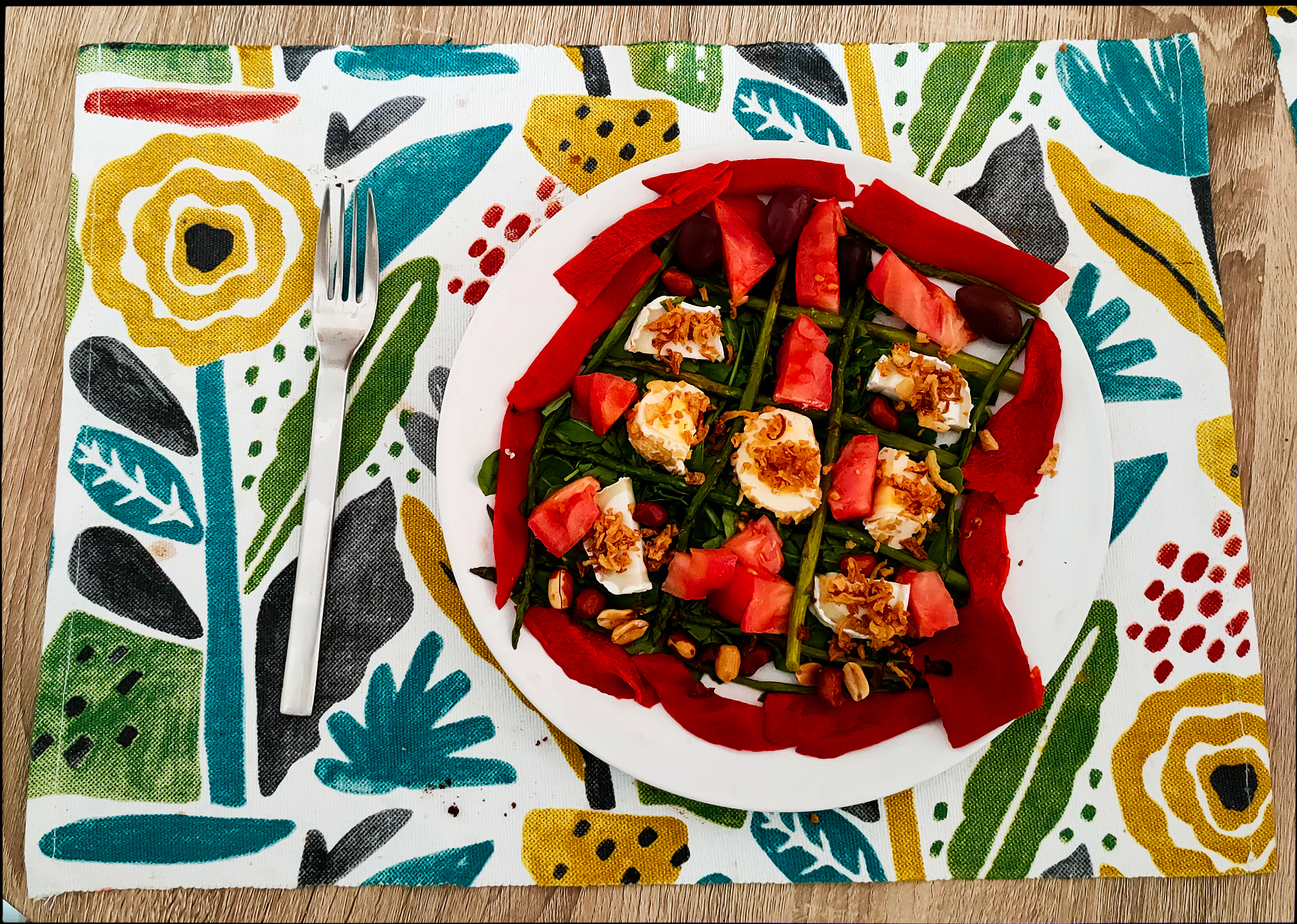 Varianta lactovegetariana: tot rucola cu sparanghel calit in unt si ardei copti, peste care am pus cubulete de rosii, branza de capra cu ceapa caramelizata, alune, masline calamata.